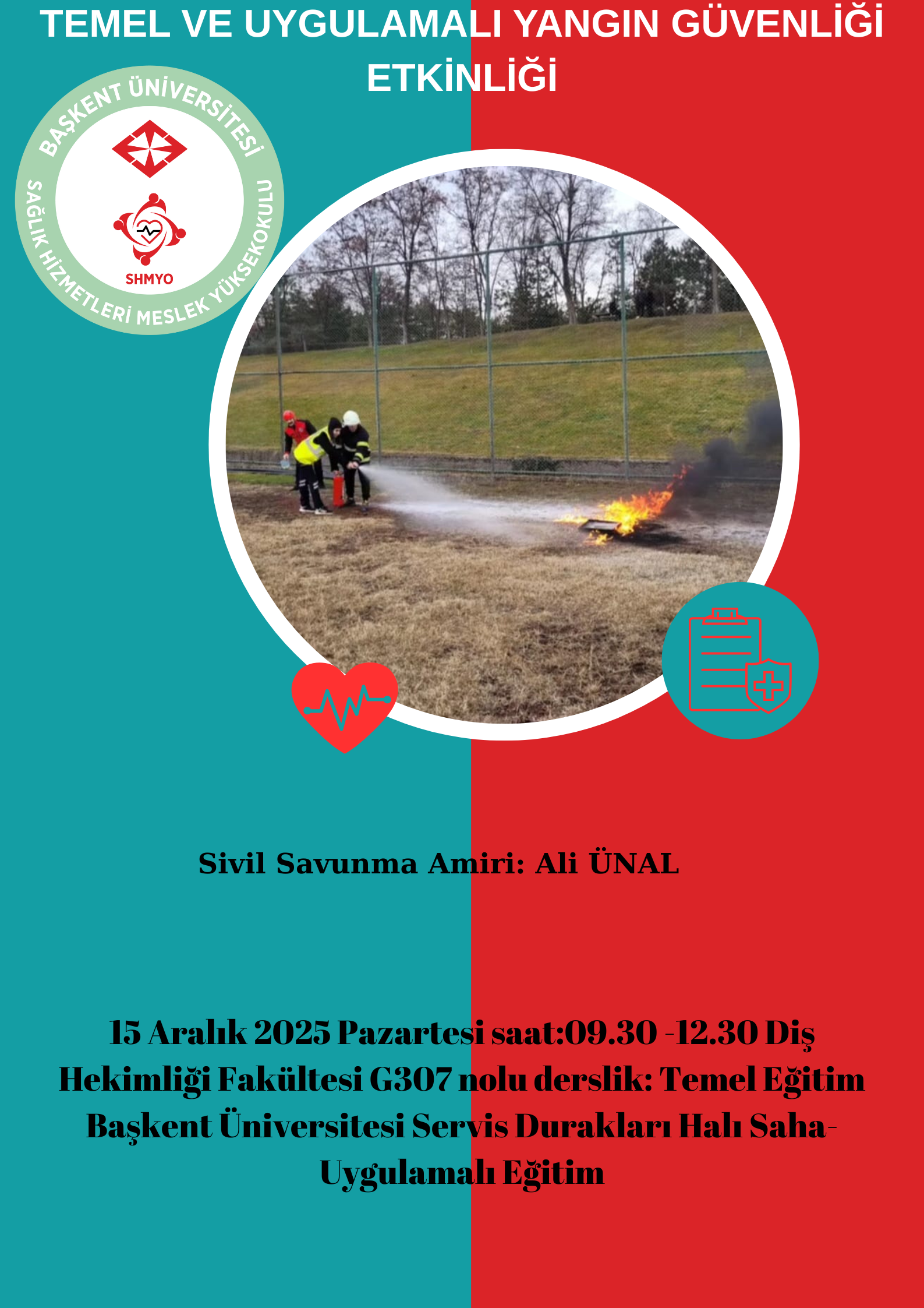 15 Aralık 2025 Pazartesi saat:09.30 -12.30 saatleri arasında Diş Hekimliği Fakültesi G307 nolu derslikte gerçekleştirilecek Temel Yangın Güvenliği Eğitimi ardından Başkent Üniversitesi Servis Durakları Halı Saha- Uygulamalı Eğitim gerçekleştirilecektir.